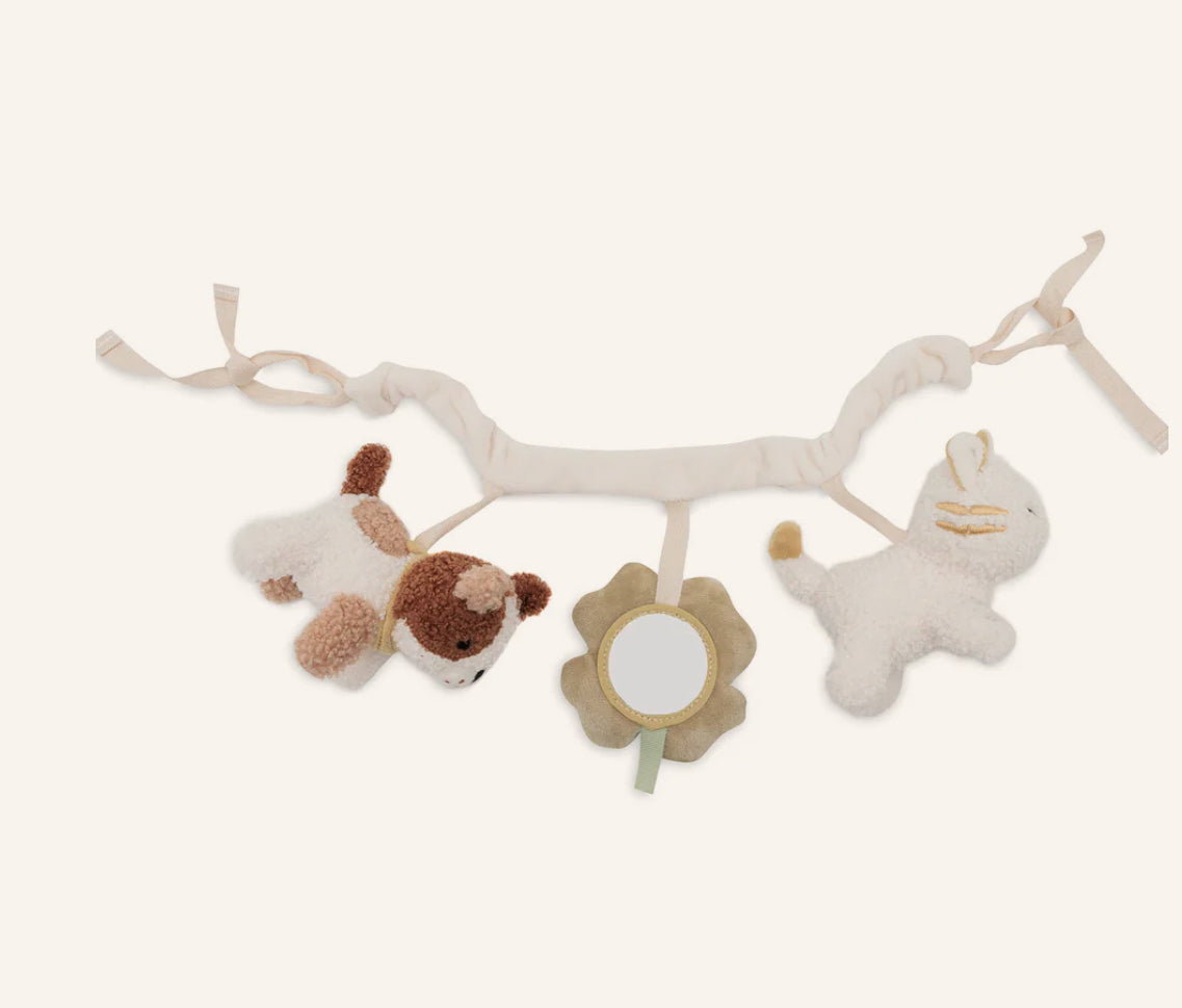 Dieser süße Kinderwagenanhänger Tiny Park ist das perfekte Spielzeug für unterwegs. Mit einem Hund, einer Katze und einem Kleeblatt, das ein kleines Spiegelchen enthält, sorgt er für Unterhaltung. Die Glöckchen machen beruhigende Geräusche – perfekt, um dein Baby unterwegs zu beschäftigen.